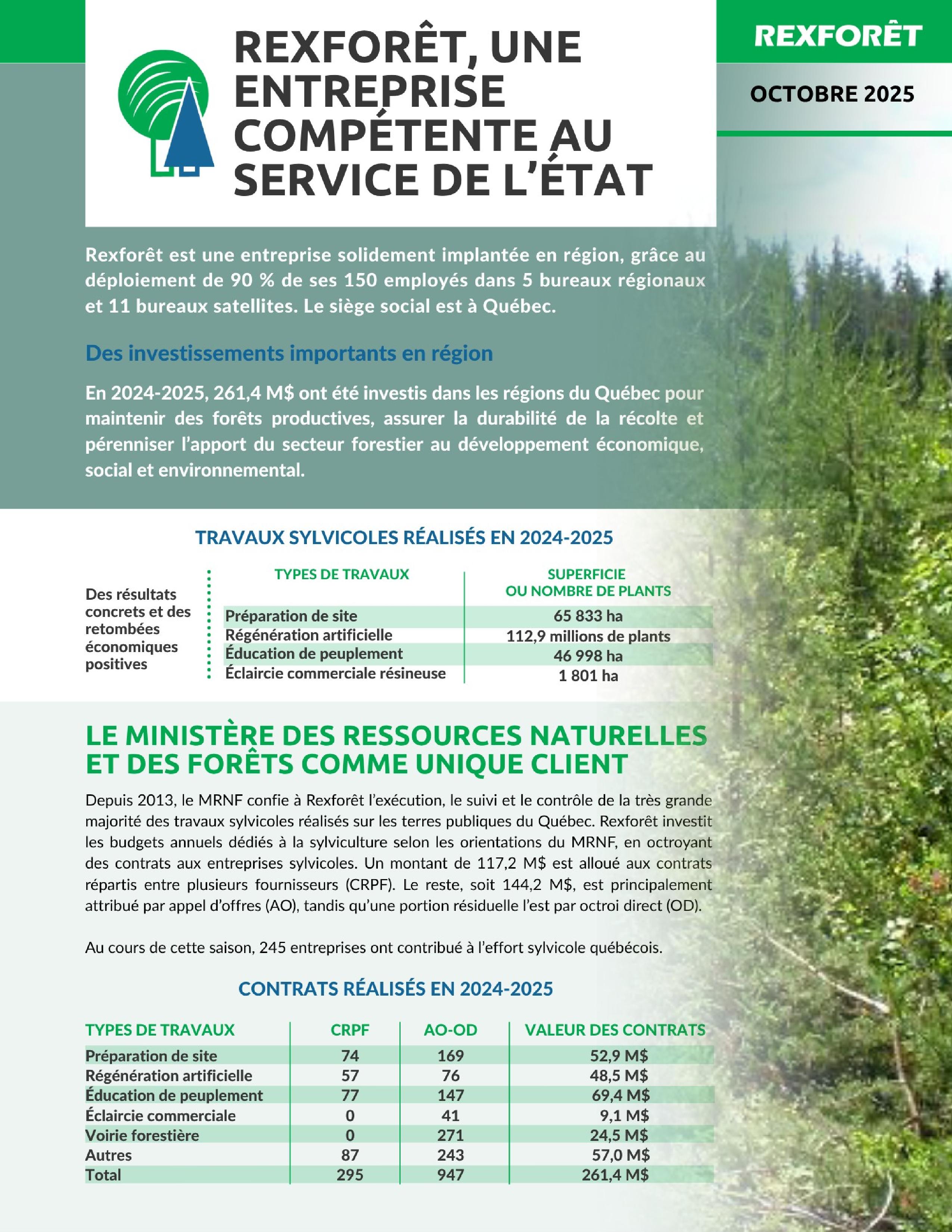 - La réalisation de travaux d’aménagement forestier sur les terres publiques du Québec : travaux sylvicoles, voirie forestière, inventaires, martelage, mesurage de bois récoltés lors de travaux d’aménagement forestier et autres.